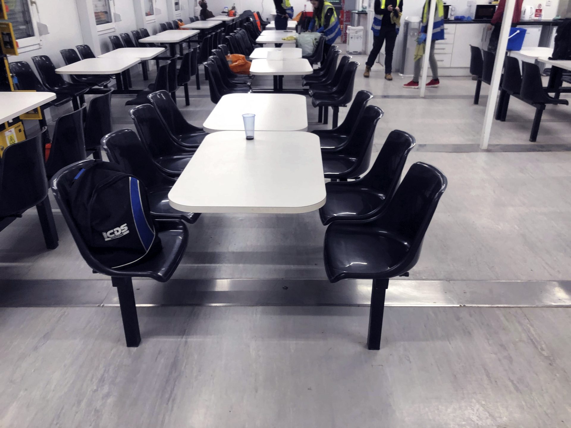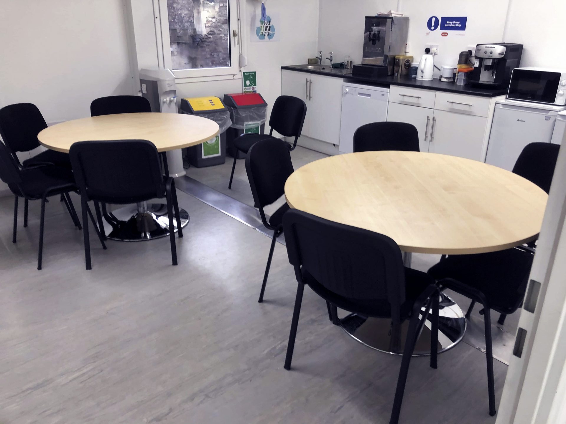 The ground floor consists of a large open canteen with tables and chairs and a kitchen area with microwaves, kettles and fridges. As you move through the large welfare unit you will find a large drying room (a heated room when the trades can dry their clothes), and at the very back are showers and toilet facilities.
